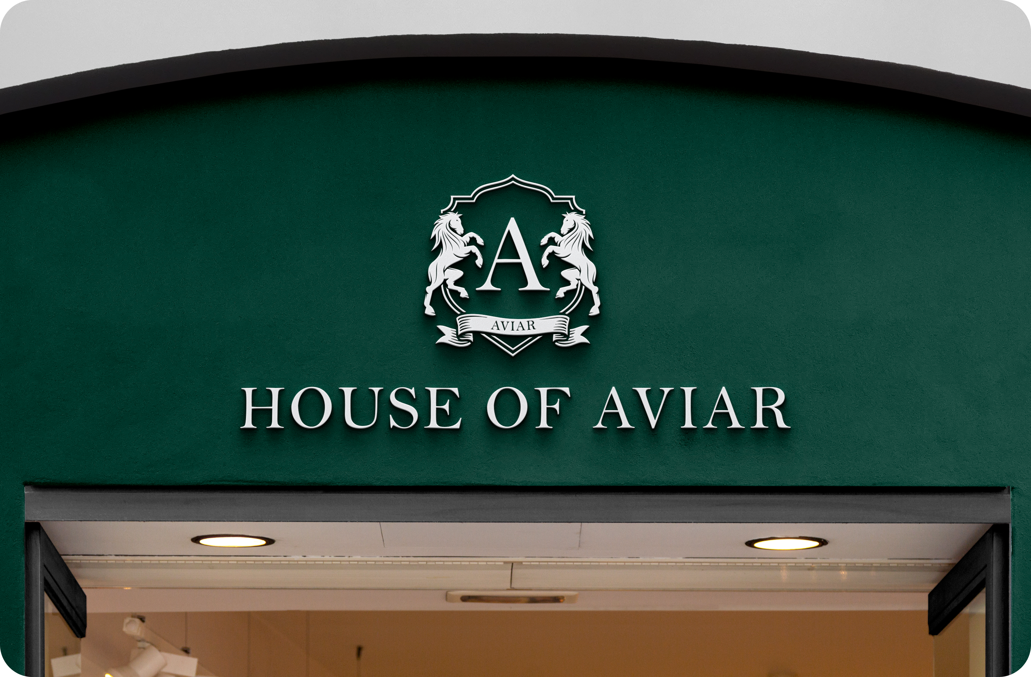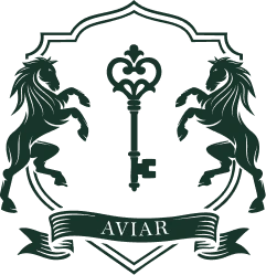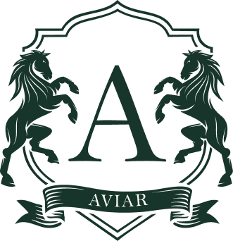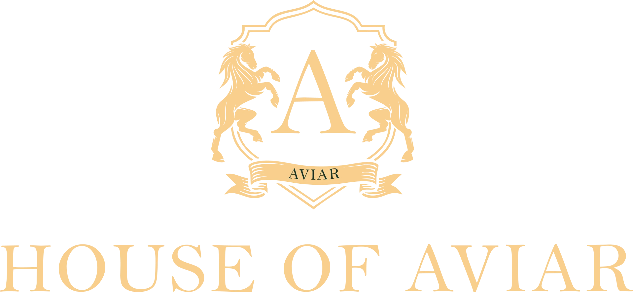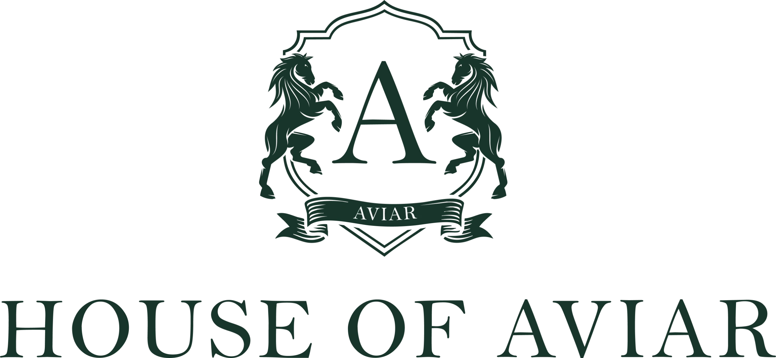 Symbol of Legacy and Authority – The crest, flanked by two poised horses, embodies strength, refinement, and enduring influence, while the central “A” and banner reflect heritage, exclusivity, and the essence of House of Aviar.