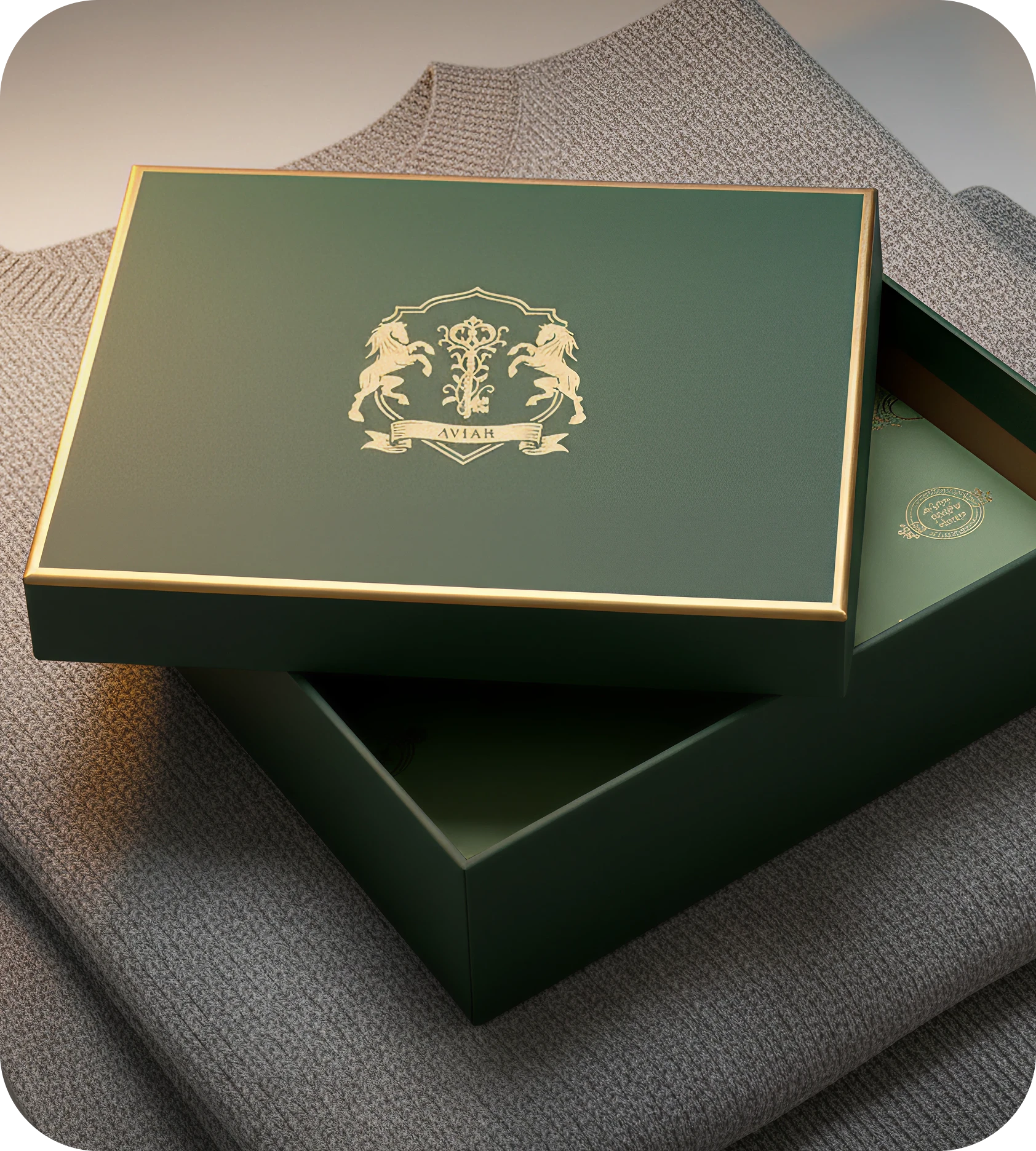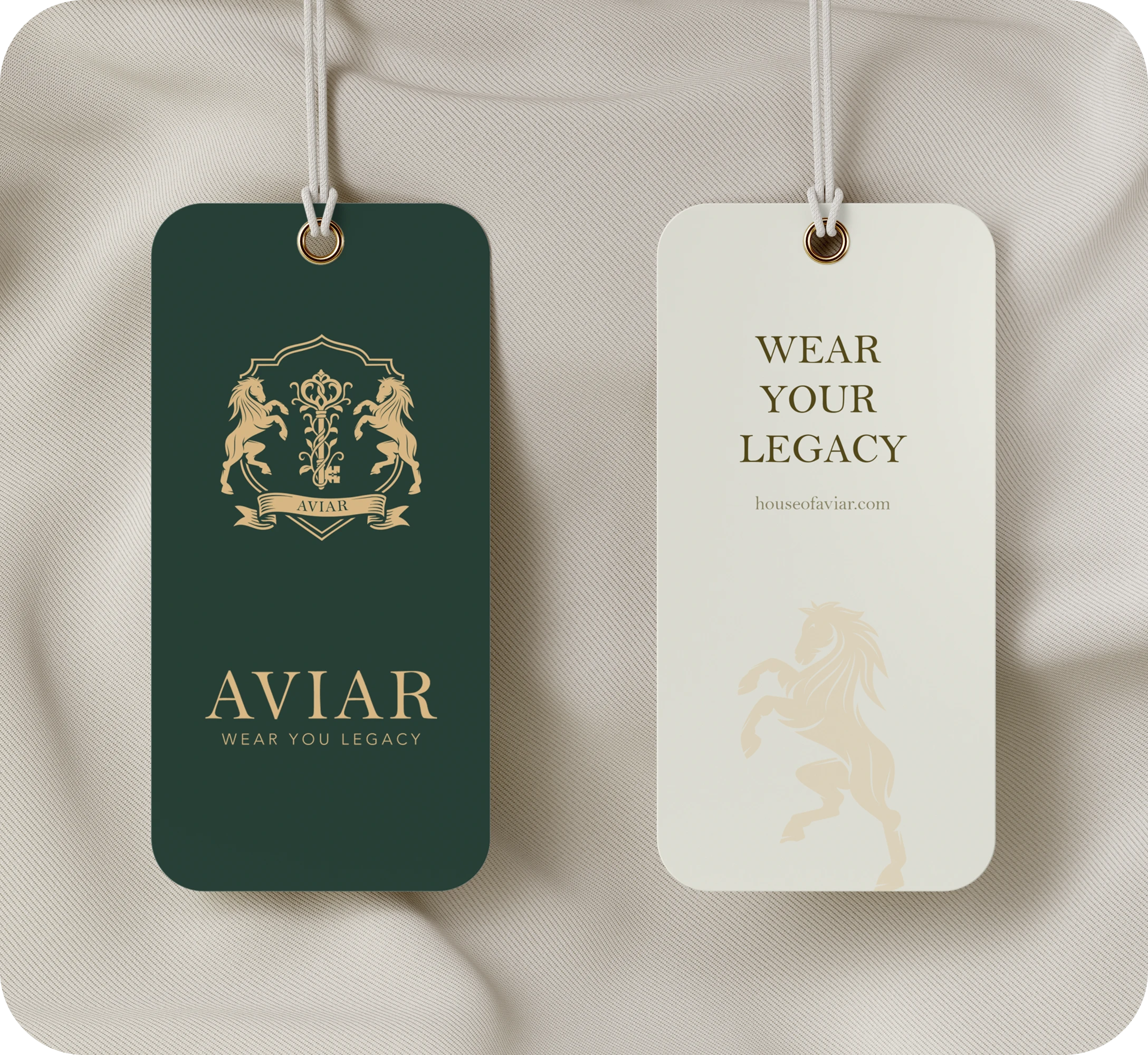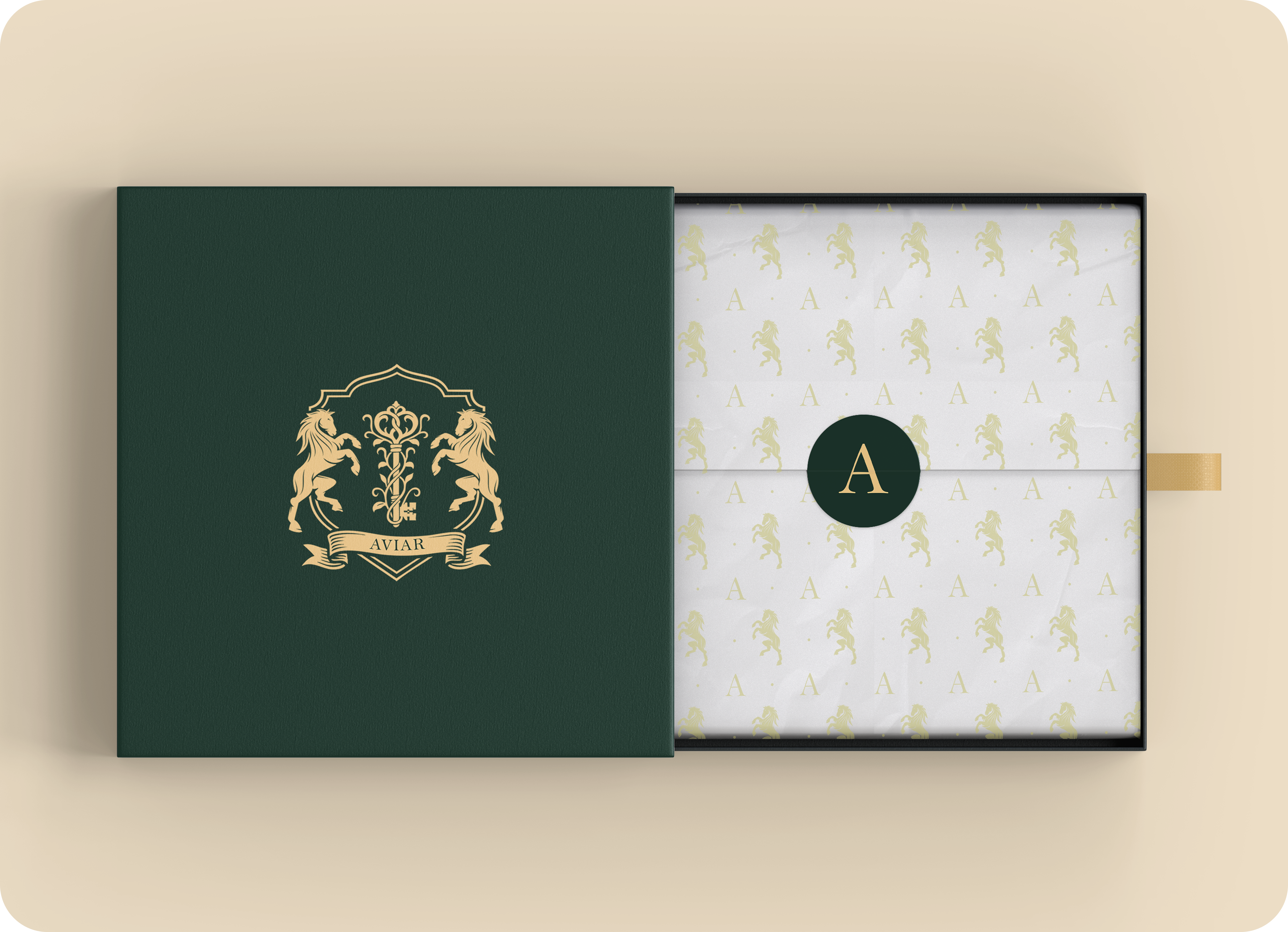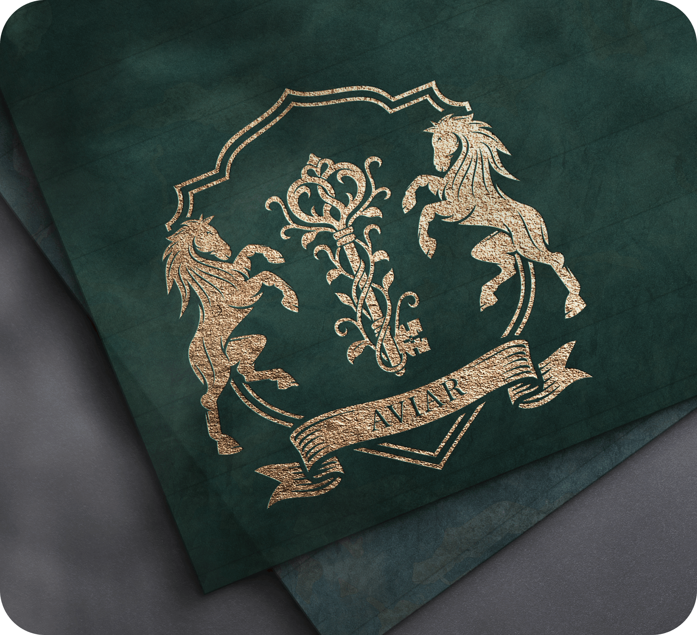 Symbol of Legacy and Authority – The crest, flanked by two poised horses, embodies strength, refinement, and enduring influence, while the central “A” and banner reflect heritage, exclusivity, and the essence of House of Aviar.