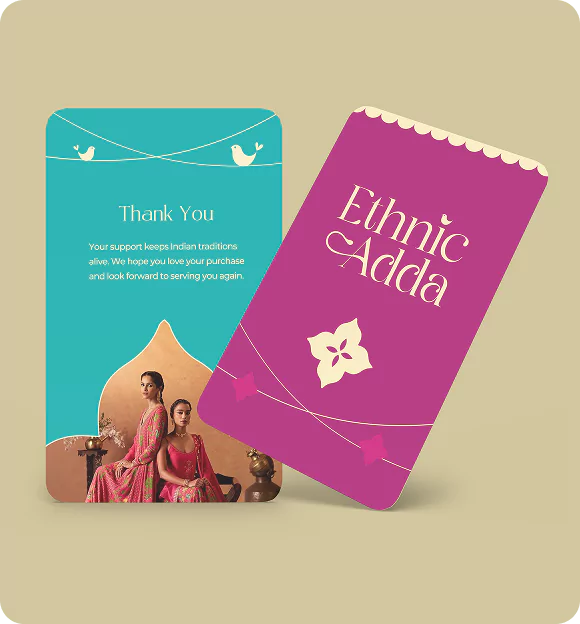 The packaging exudes timeless sophistication, dressed in a deep magenta that feels rich yet inviting. Subtle floral and bird motifs add a poetic touch, reminiscent of India’s artisanal charm reimagined for the modern eye. Every detail from the graceful typography to the soft sheen of the material reflects Ethnic Adda’s promise of elegance and individuality. This isn’t just packaging; it’s an experience that hints at the beauty and craftsmanship waiting inside.