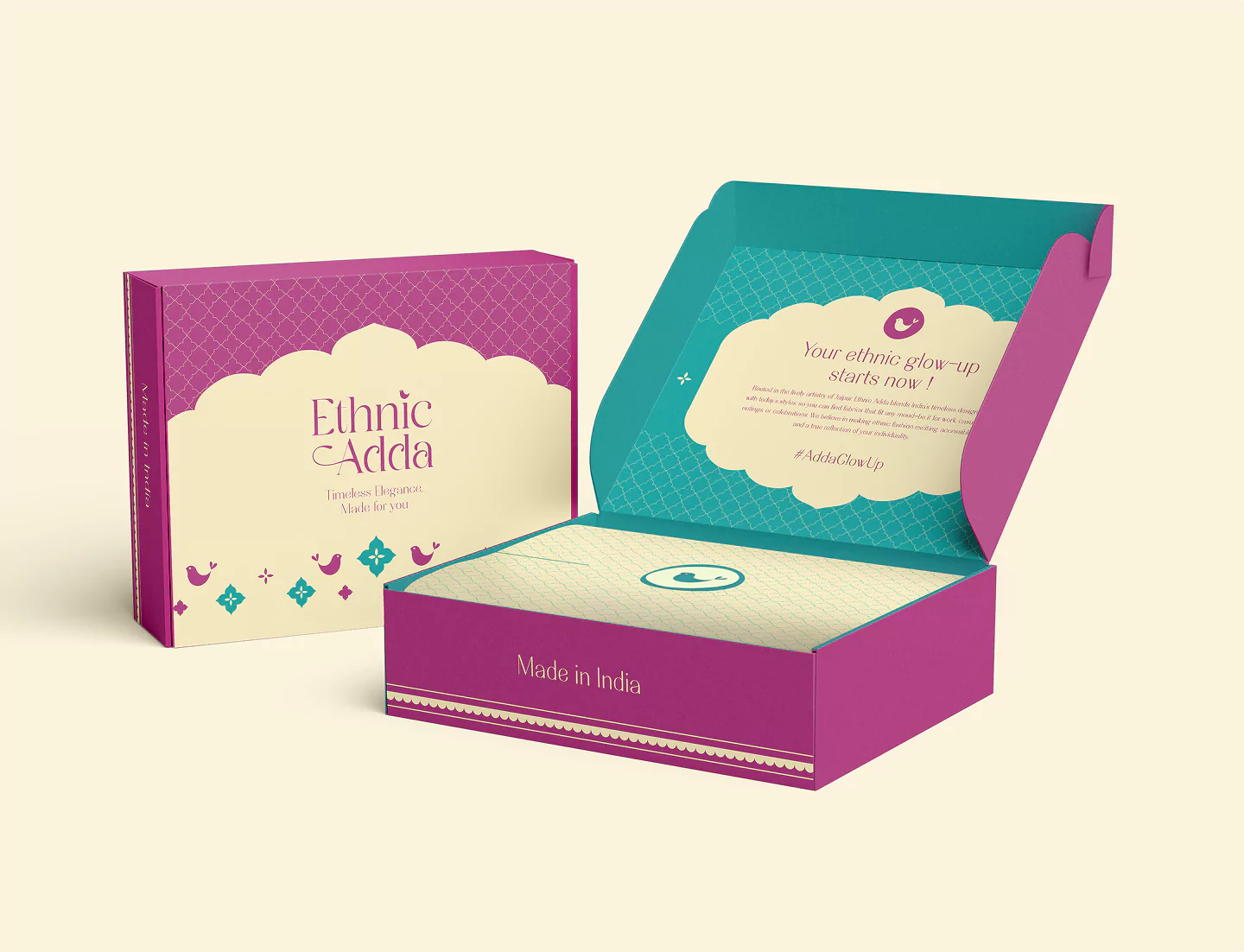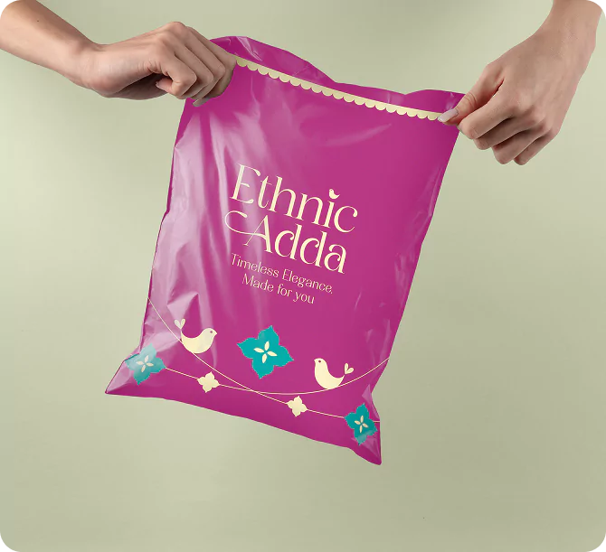 The packaging exudes timeless sophistication, dressed in a deep magenta that feels rich yet inviting. Subtle floral and bird motifs add a poetic touch, reminiscent of India’s artisanal charm reimagined for the modern eye. Every detail from the graceful typography to the soft sheen of the material reflects Ethnic Adda’s promise of elegance and individuality. This isn’t just packaging; it’s an experience that hints at the beauty and craftsmanship waiting inside.